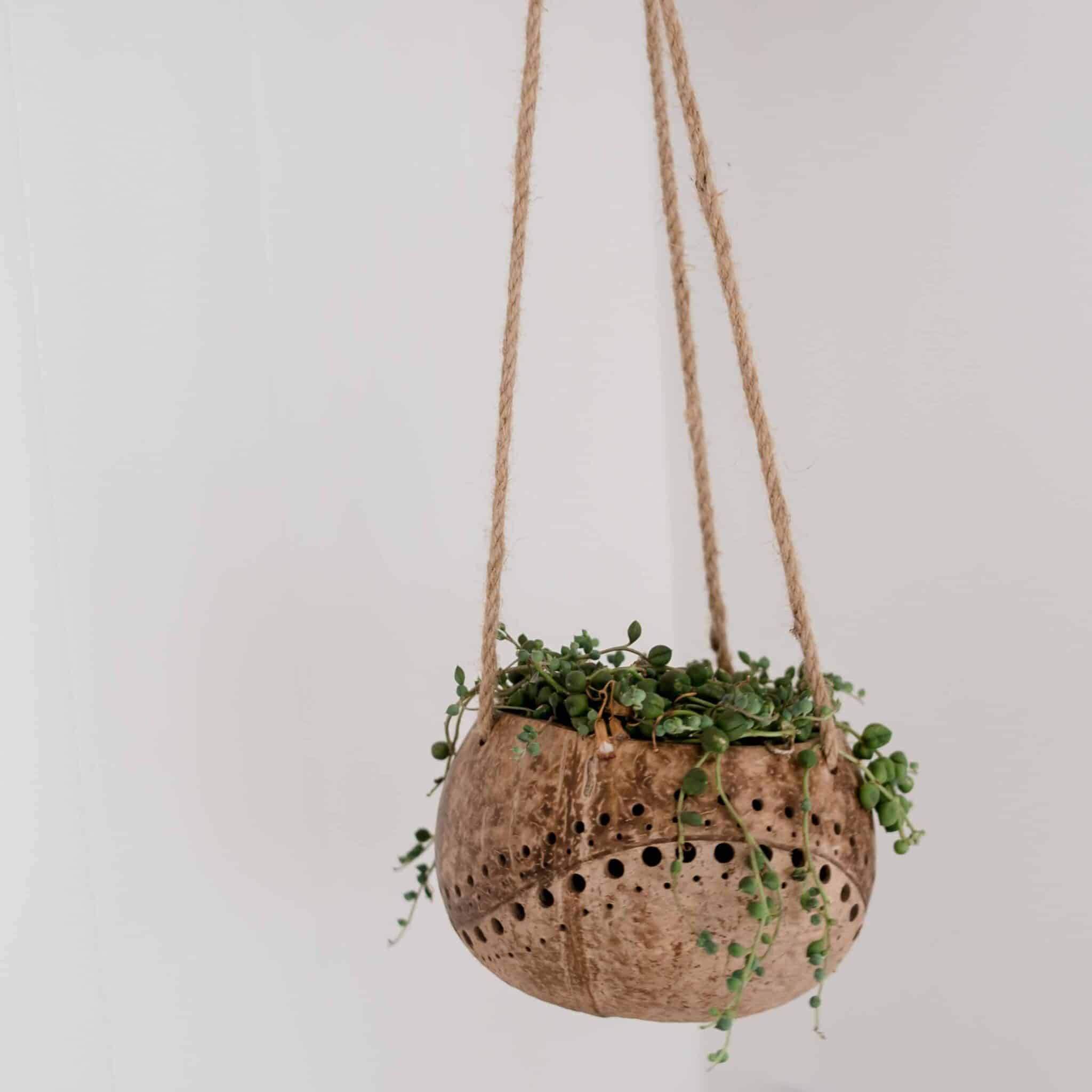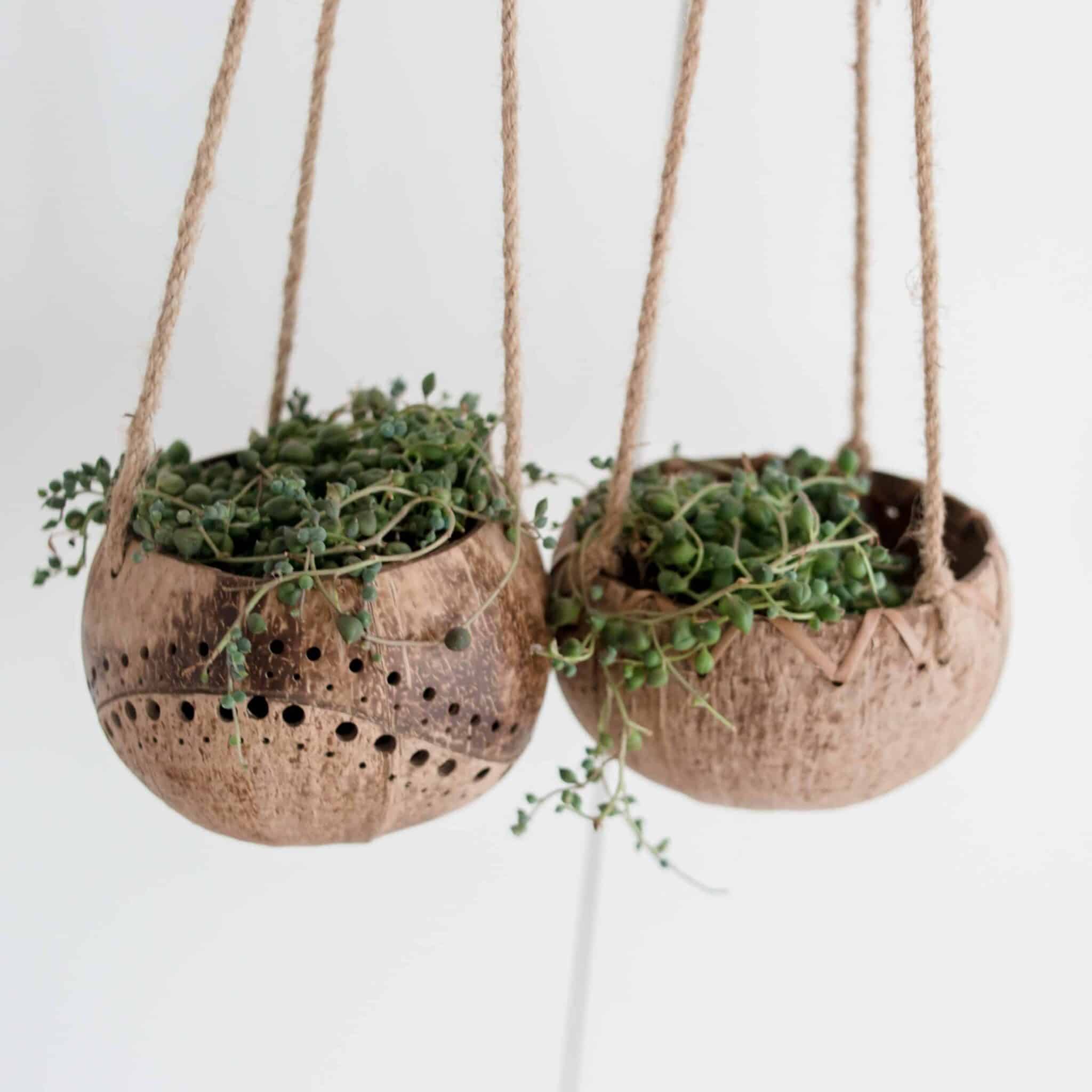 This hanging pot is a perfect example of recycling as it repurposes discarded coconut shells that would otherwise go to waste. By transforming them into functional and aesthetic plant holders, it promotes sustainable practices and helps reduce environmental impact.