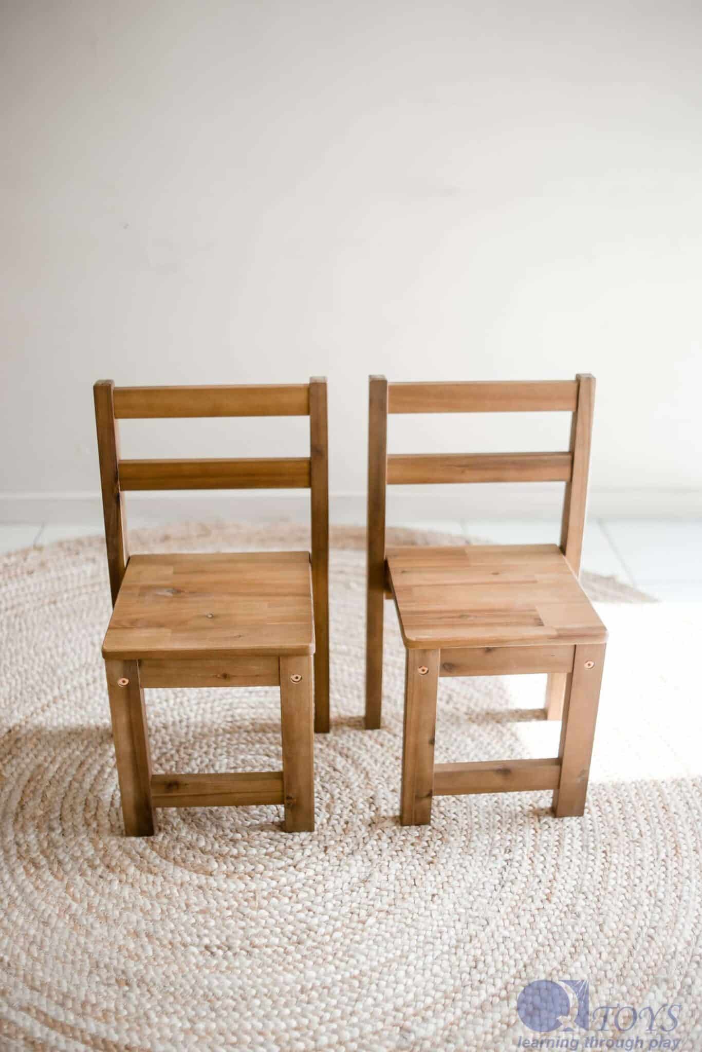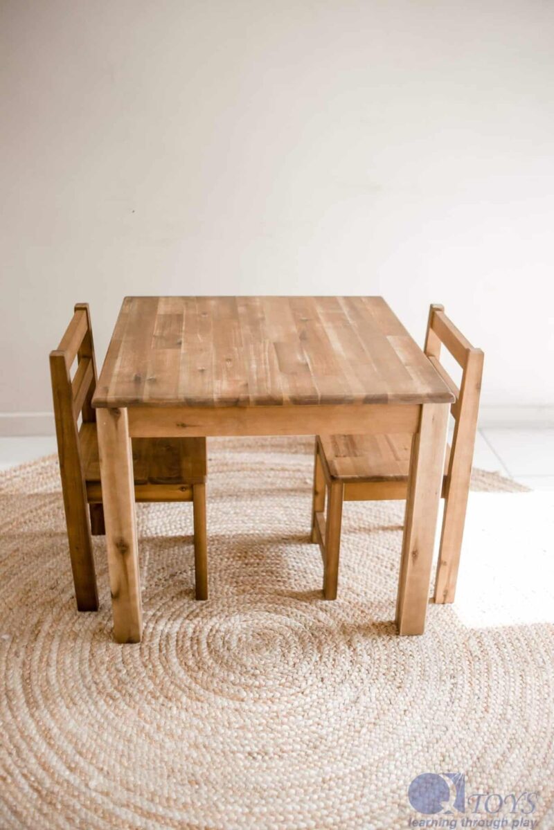 A beautiful set of hard wood table and 2 standard chairs. This item is made of Acacia hardwood, oiled. Standard chairs are suitable for children up to 4 years of age. We have other version of bigger chair that match (Search for 069). Table and chairs come flat packed. The colour of this furniture set may vary due to the natural timber variations found in the wood.