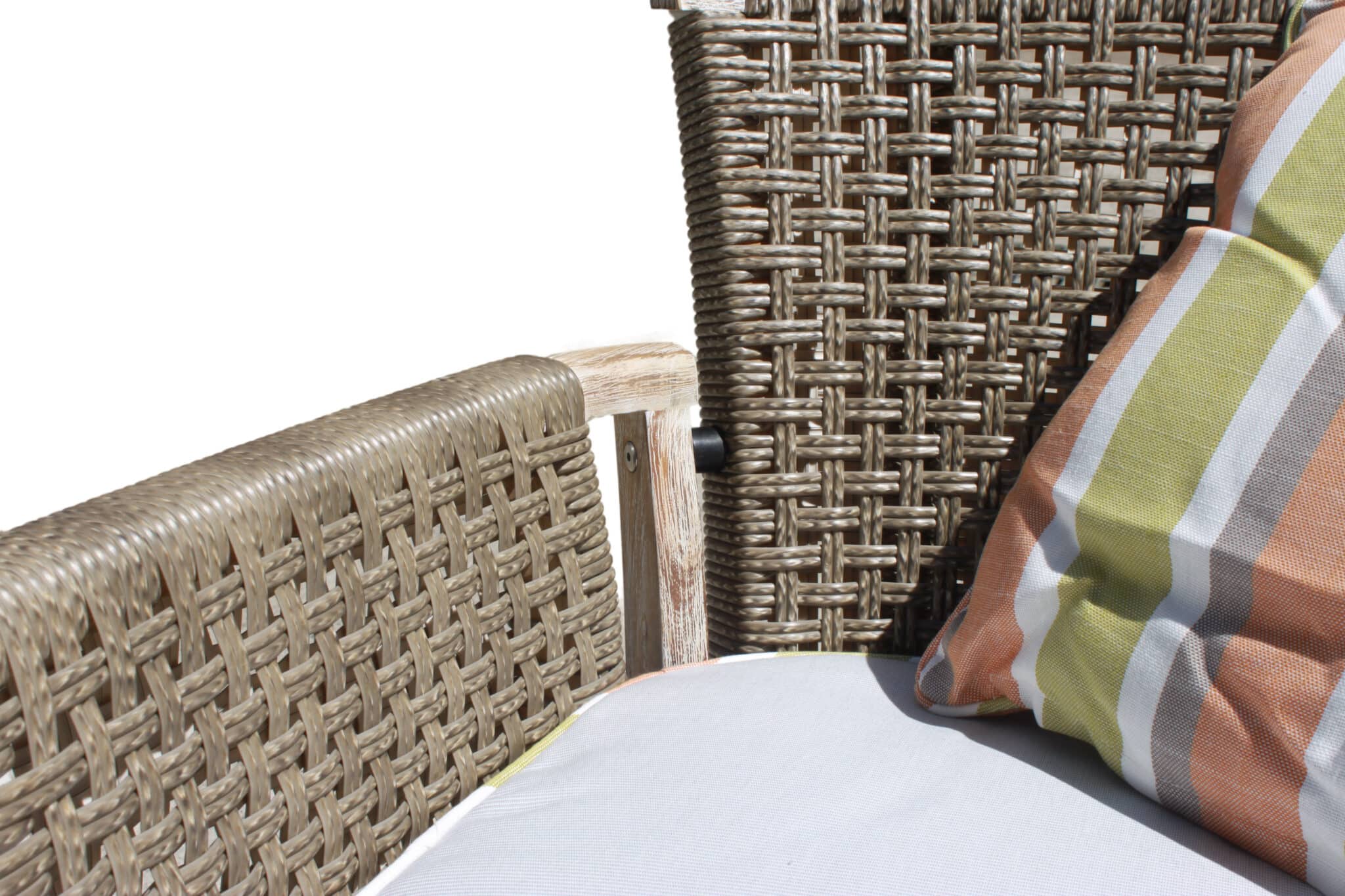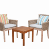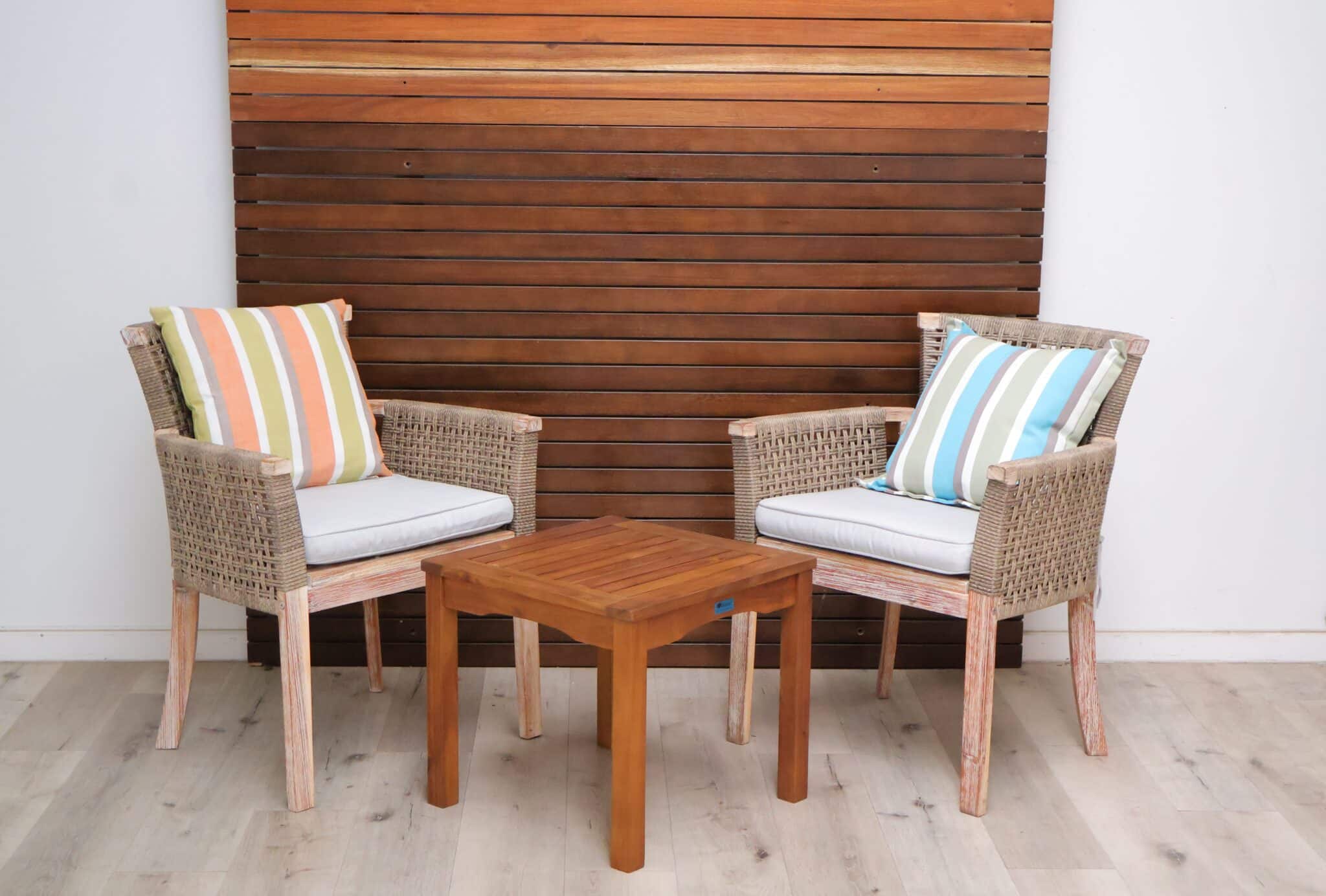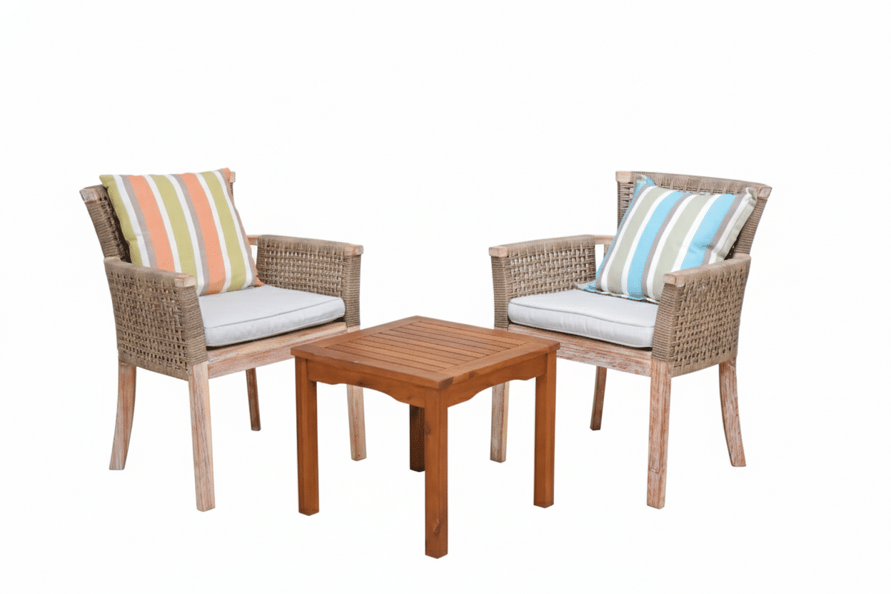 Crafted for Enduring Beauty: Each armchair and the convenient matching side table feature robust frames constructed from premium Acacia Wood. Renowned for its natural resistance to weather, rot, and insects, acacia ensures your furniture stands strong season after season. Complementing the sturdy frames are beautifully woven Wicker accents, adding a touch of classic elegance and inviting texture that blends seamlessly with any outdoor décor.