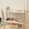 In addition, the shelf’s minimal construction allows it to blend effortlessly with a variety of room styles. It can also double as a display table for wooden toys or nature-based activities. As a result, educators and parents alike will find this shelf both practical and visually pleasing.