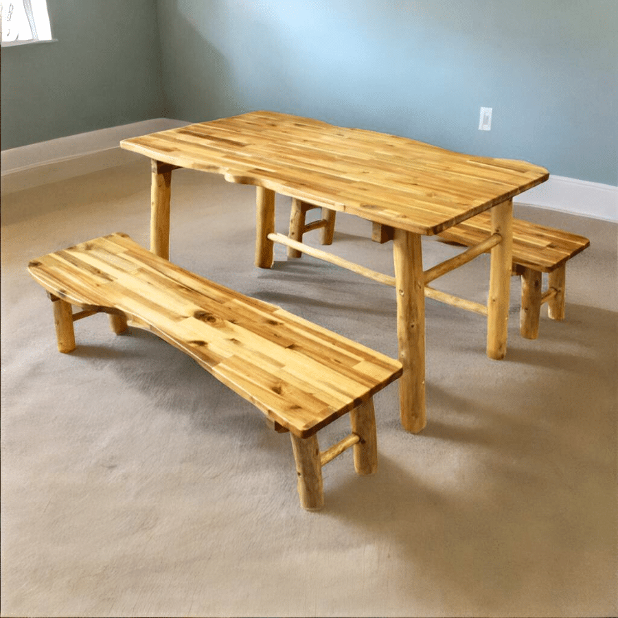 Beautiful hand crafted children outdoor furniture. The set include 1 table and 2 benches the table is 90 x 60 x 50 cm high the bench is 90 x 40 x 30 cm high. This a great outdoor setting for childcare centres or home. The set is made from recycled tree branches and Acacia hardwood.