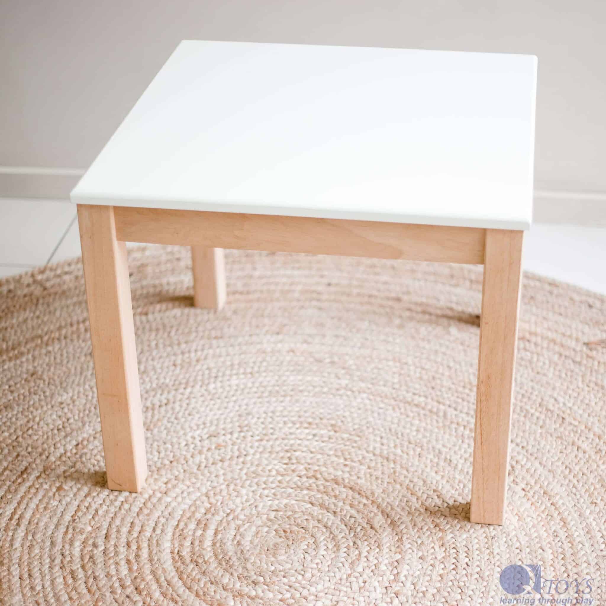 The White Top Timber Table boasts several notable features. Firstly, it is made from high-quality Acacia hardwood, ensuring durability and longevity. The white paint finish not only adds a touch of sophistication but also protects the wood, making it resistant to wear and tear. Moreover, all Qtoys products, including this table, are crafted using plantation timber and child-safe materials, making them eco-friendly and safe for your home environment.